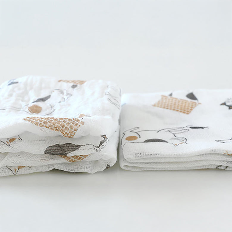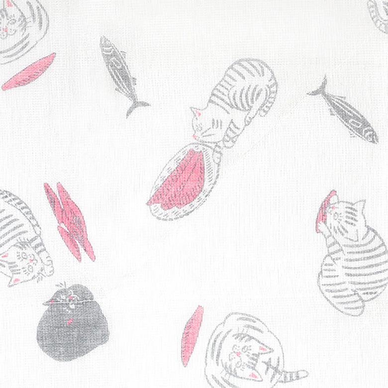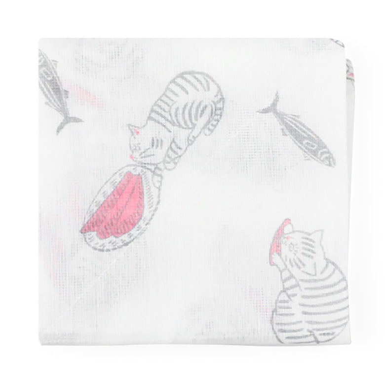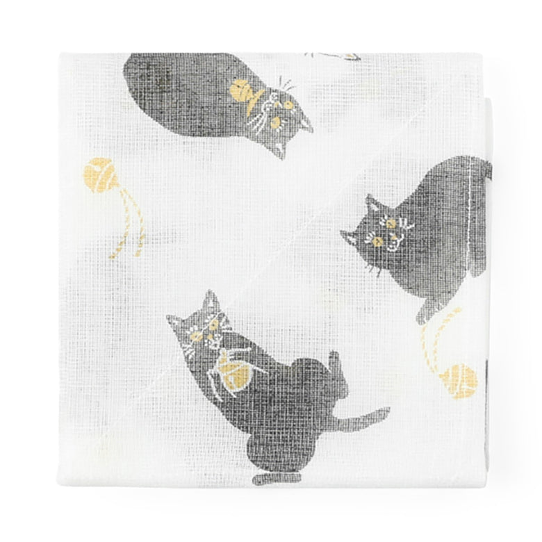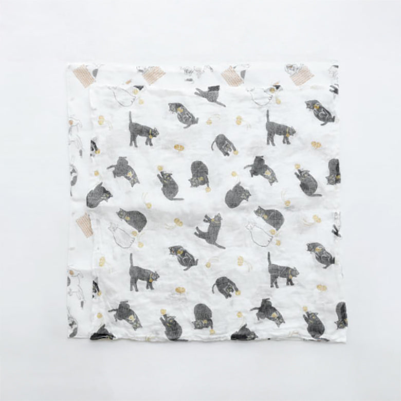 中川政七商店のベストセラー「花ふきん」。この花ふきんをお手本に約58cm×58cmの大判の2枚仕立て、パッケージも同じ"たとう紙"で包んだ「はにゃふきん」を作りました。それぞれ猫を使ったことわざにちなんだ絵柄になっています。