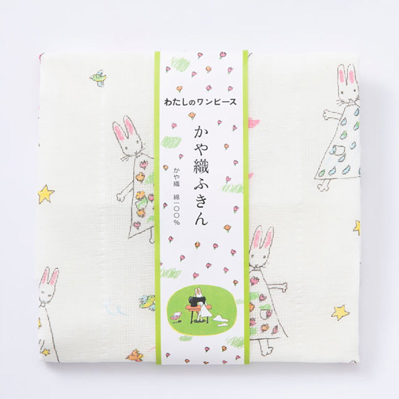 日本を代表するファンタジー絵本「わたしのワンピース」とのコラボふきんです。奈良の工芸「かや織」は奈良時代に日本に伝わった、「風は通すが蚊は通さない」という蚊帳(かや)に使われる目の粗い薄織物。