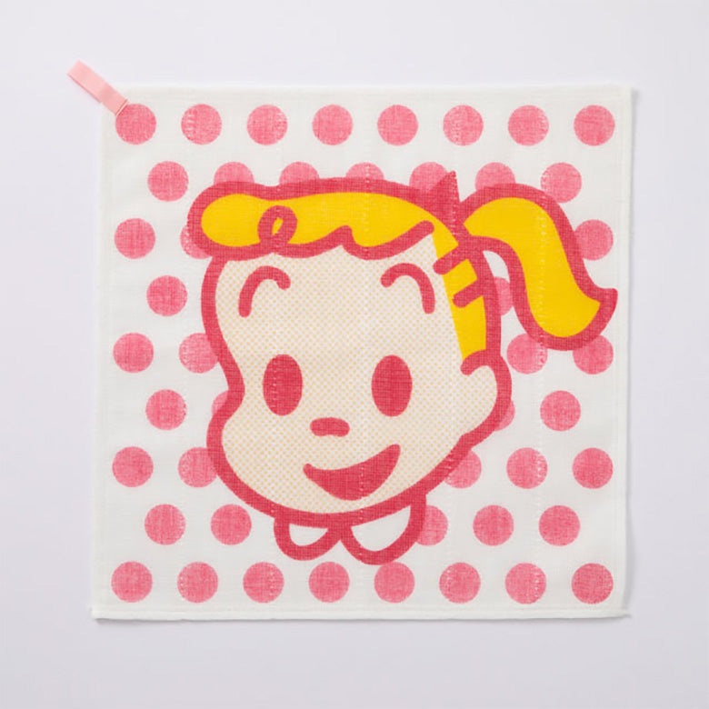 愛らしいキャラクターが映えるよう、30cm角の正方形のふきん全面に大きく顔をデザインしました。背景にはドットやボーダーなど明るくポップな柄をあわせ、キャラクターの魅力を引き立てています。ふきんの端にはアクセントとなるループが付いており、干す時などフックに掛けて便利にお使いいただけます。