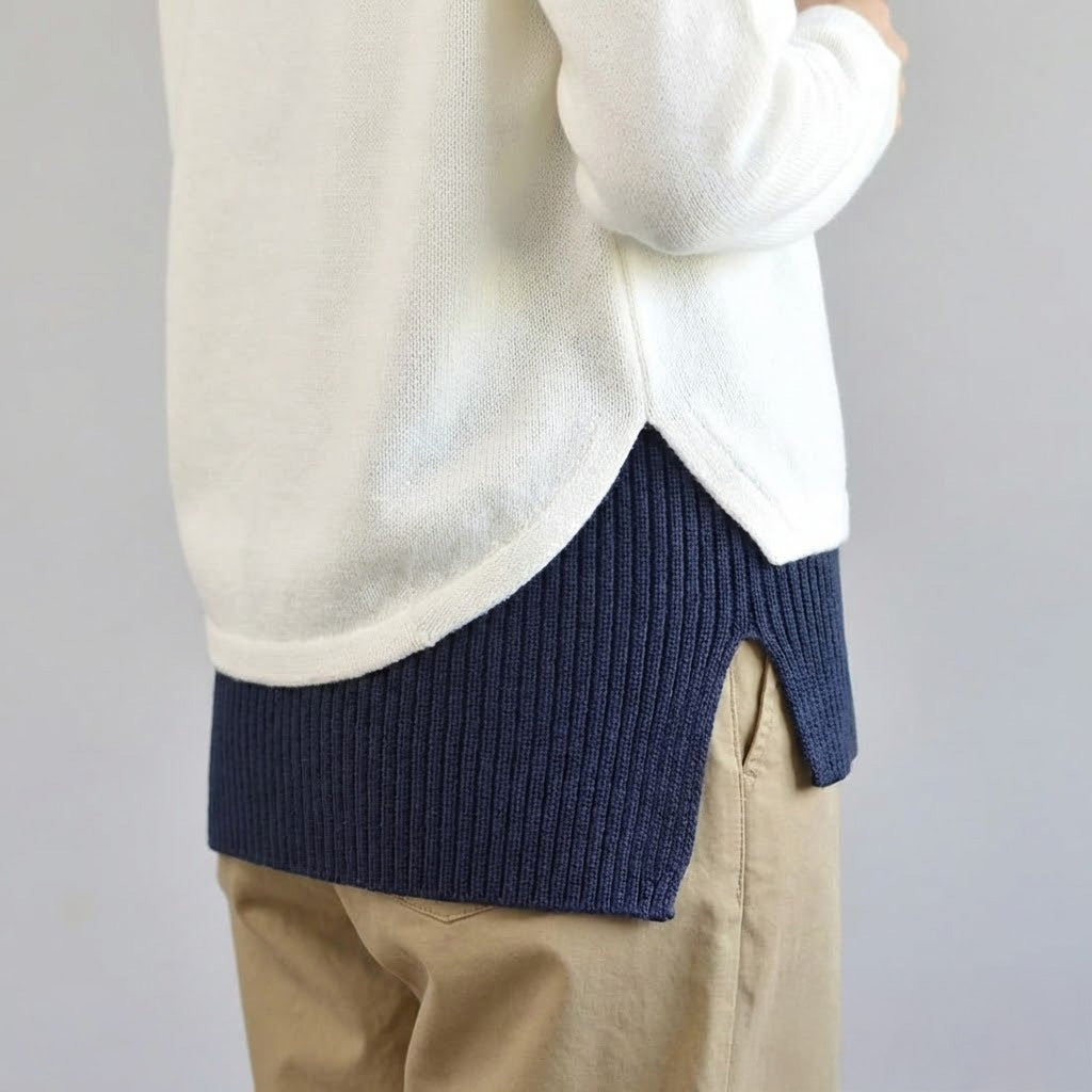 裾部分はローゲージのリブ編み、おなか部分はすっきりとハイゲージで編むことで、着ぶくれせずに違和感なく重ね着に。