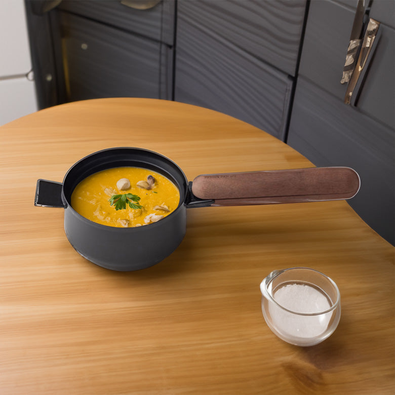デザインは、丸みを帯びたミニマルデザインを採用。ホーローの深い艶と相まって、食卓にも馴染む佇まいを誇ります。直径約14cm・容量は1000mlと1〜3人分の調理に適したサイズ感で、一人暮らしからファミリーまで幅広く対応。味噌汁はもちろん、トマト煮込みやキムチチゲといった酸の強い料理にも活用いただけます。