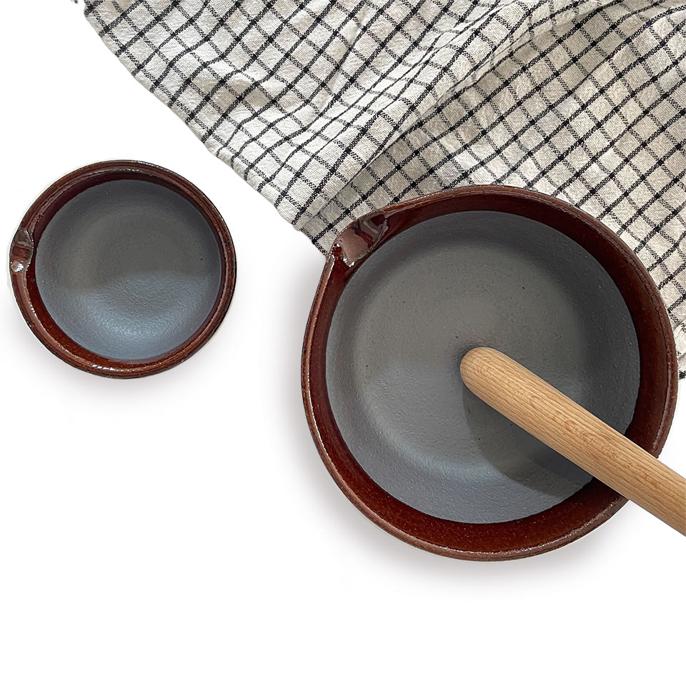 一般的なすり鉢についている細かな溝。どうしてもその溝に素材が詰まってしまい、叩いて落としたり、爪楊枝で溝を掘ったりと後始末が少し面倒。その溝を取り去り、底面を平らに、側面は従来のものより切り立った形にすることで素材をすり潰しやすく、さらに器の外に逃げにくい構造にしました。溝がなくなったことで、素材も詰まることなくサッと取れて、洗い物もしやくすなっています。