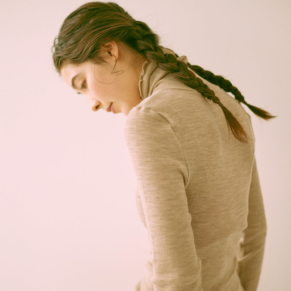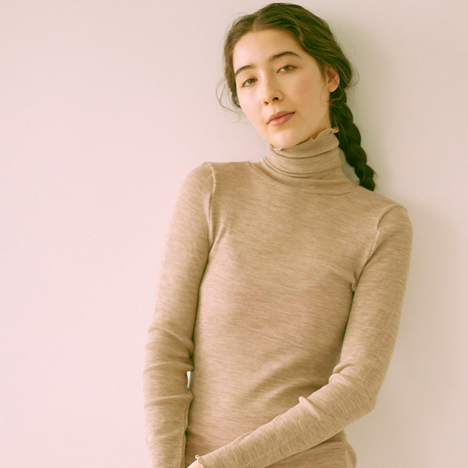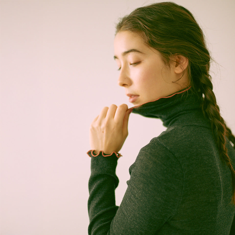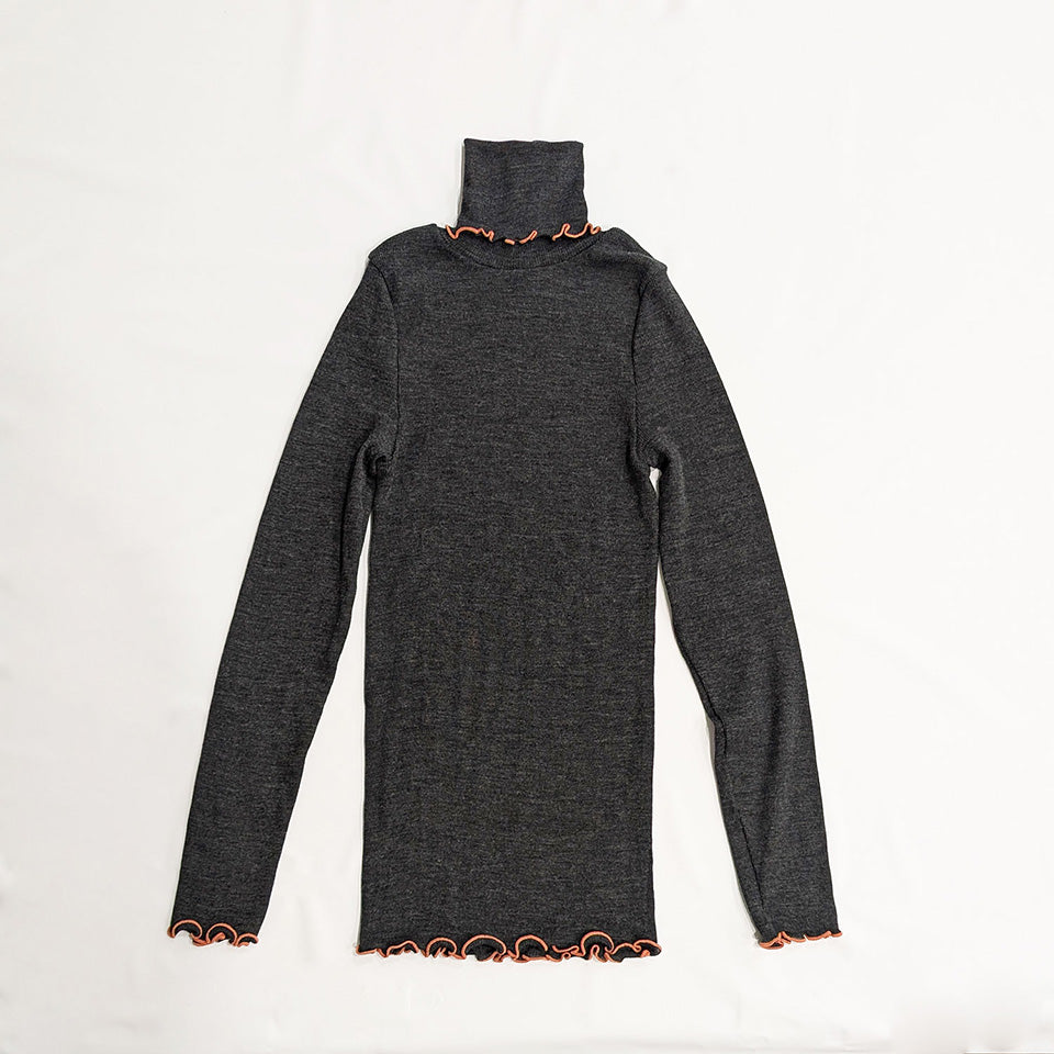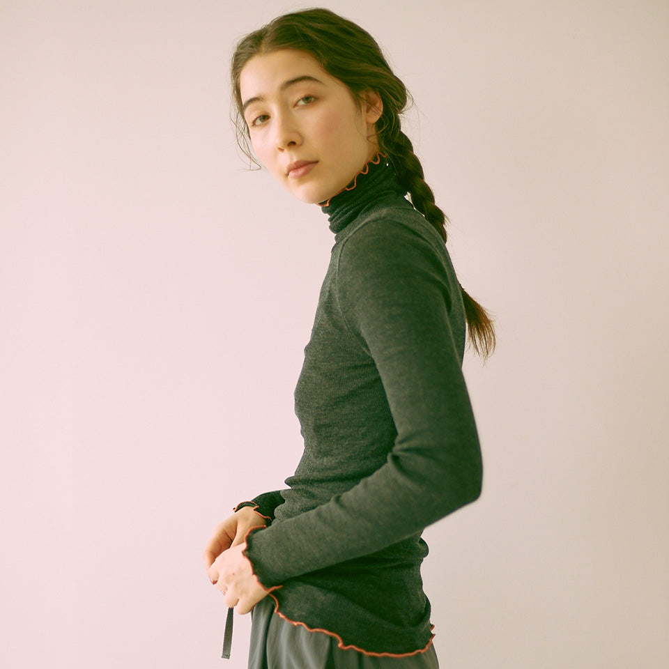 チャコールxオレンジ防縮加工をした17.5マイクロンの極細メリノウールを100%使用し、古い編み機で空気を含ませながら、職人さんの技術によってとても風合い良く編み上げています。