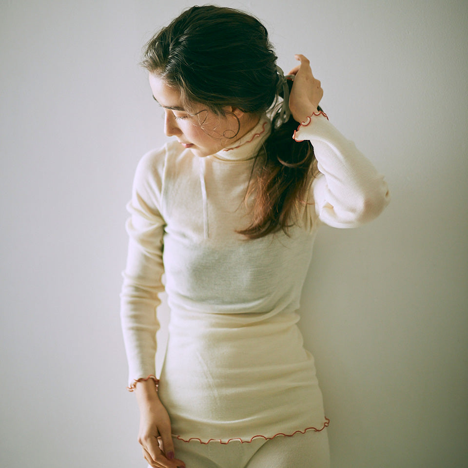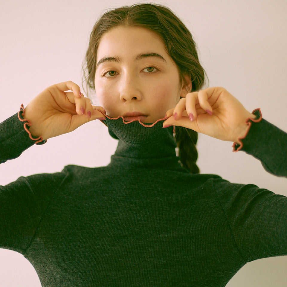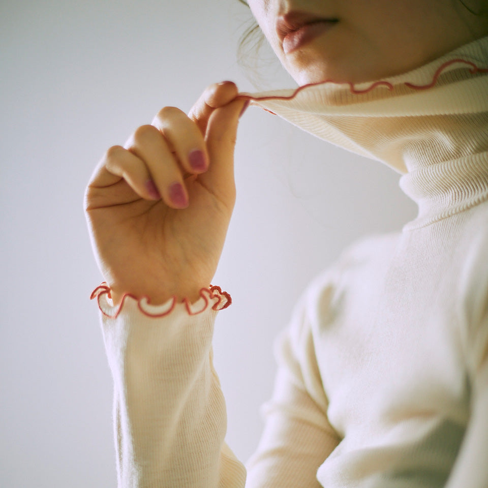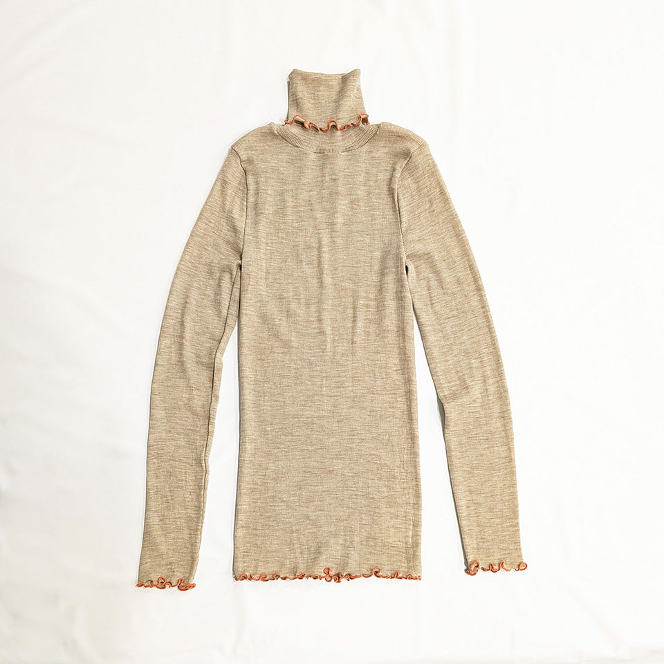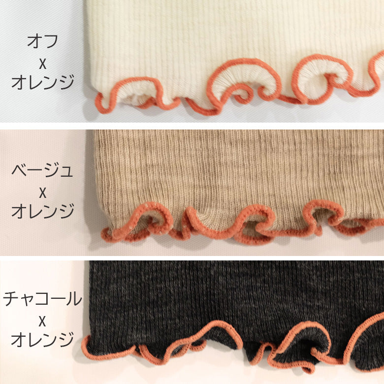 チャコールxオレンジ防縮加工をした17.5マイクロンの極細メリノウールを100%使用し、古い編み機で空気を含ませながら、職人さんの技術によってとても風合い良く編み上げています。
