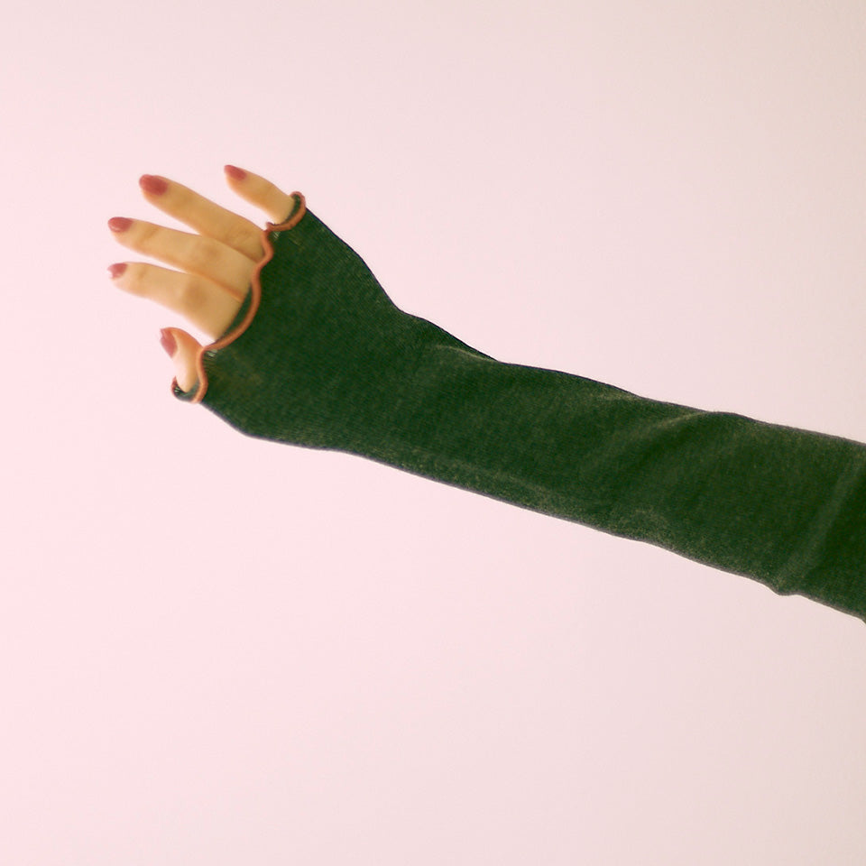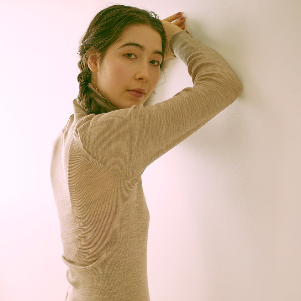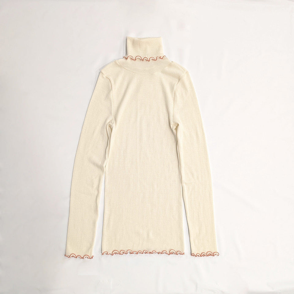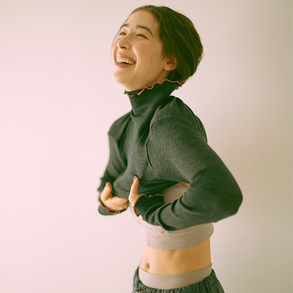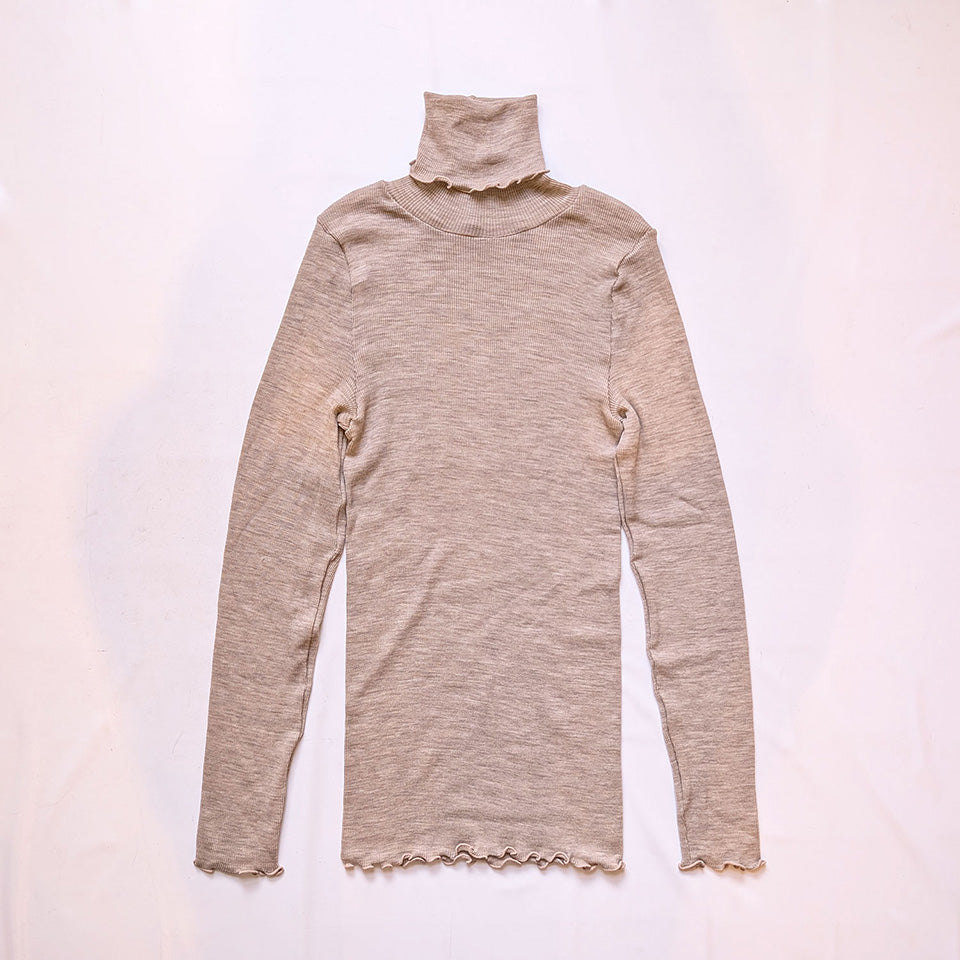 チャコールxオレンジ防縮加工をした17.5マイクロンの極細メリノウールを100%使用し、古い編み機で空気を含ませながら、職人さんの技術によってとても風合い良く編み上げています。