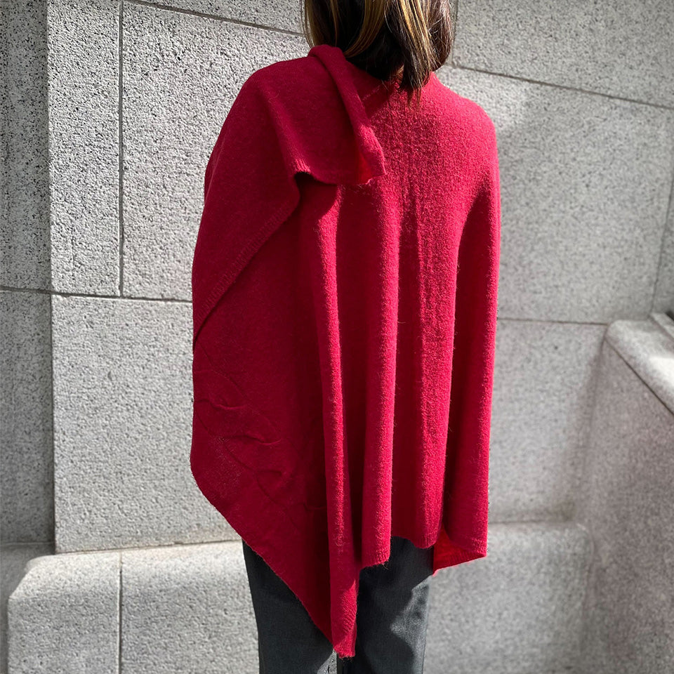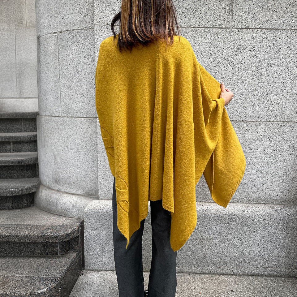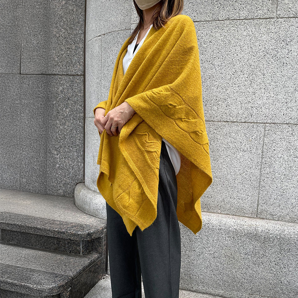 肌寒い季節にほっこりする大きなケーブル柄のポンチョです。
