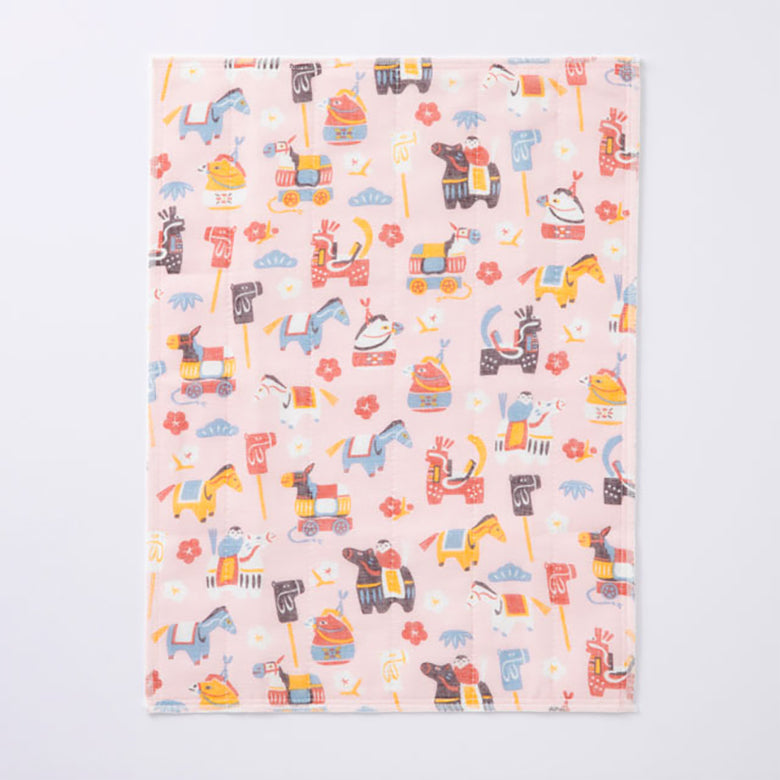 全国各地の郷土玩具から着想した干支のモチーフと、縁起物である松竹梅を散りばめたかや織ふきん。