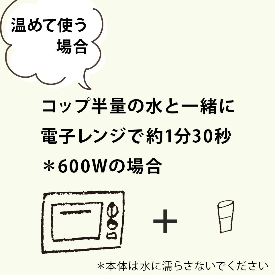 600wの家庭用電子レンジで1分加熱し、身体に当てるだけ。首の後ろ、肩、お腹、足、お尻など、ご自身の体の温めたい部分に使用してください。保湿と焦げつき防止のため、電子レンジ対応のコップに半分水を入れて、一緒に温めるようにしてください。