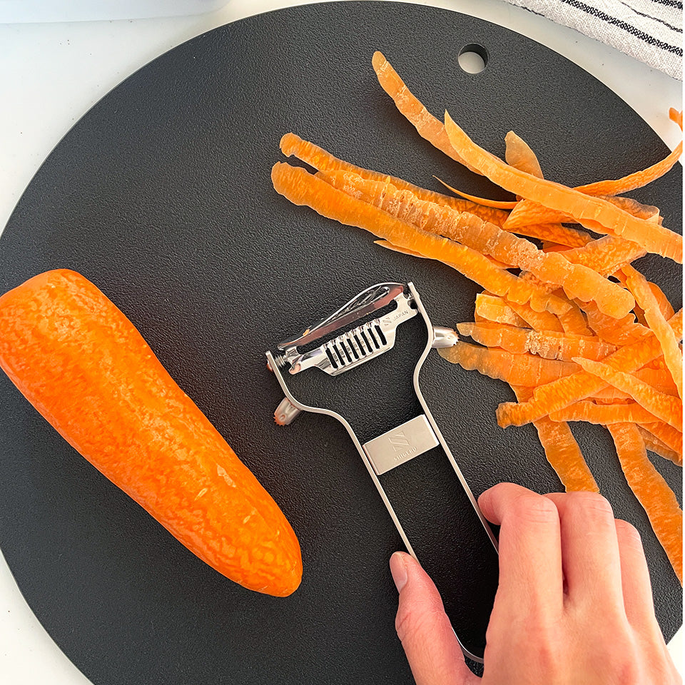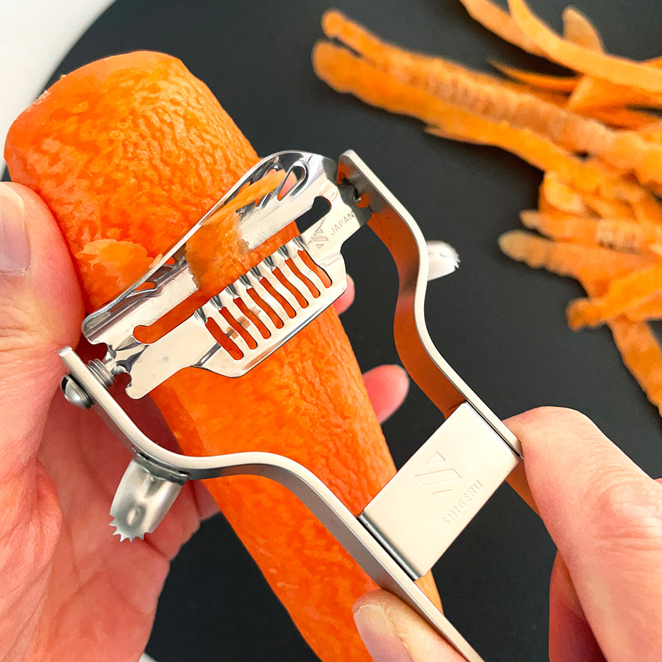 力を入れずに扱えるため、長時間の調理でも疲れにくく、断面がツヤツヤと光り輝くほど美しく仕上がります。厚みを自在にコントロール。皮むきからスライスまでこれ一本で