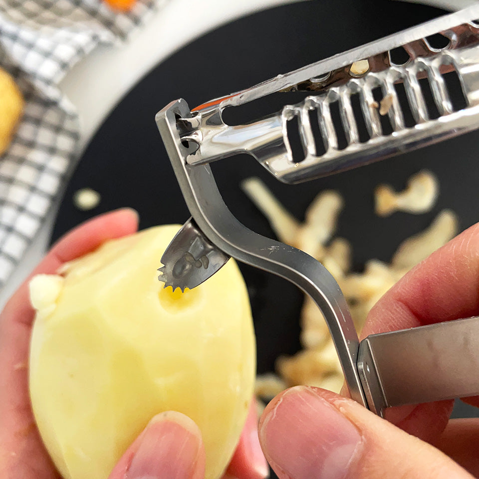 立体的にカーブした羽のようなパーツは、むいた皮が手や本体にくっつくのを防ぎ、一箇所にまとまるように設計されています。