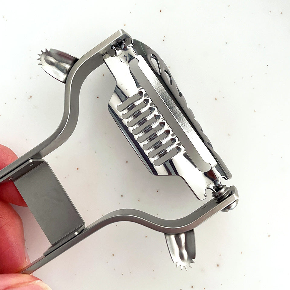 左右どちらの手でも使えるよう両側に設置されています。雪かきのスコップのように、くり抜いた食材がくっつきにくい設計です。