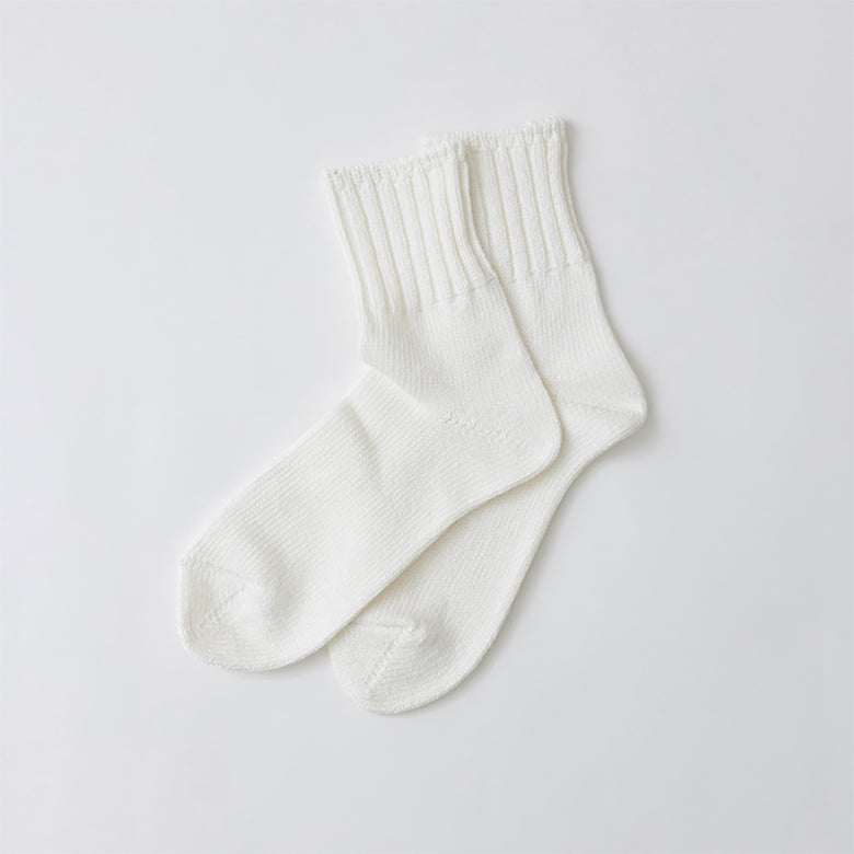ローゲージの編機で贅沢にコットンを使い、高密度でハリのある生地に編みあげました。はき口はゴムを使わずリブのみの自然にフィットするレシピで仕上げています。さらりとした肌ざわりとコシのある爽やかなはき心地です。サイズ S(22-24cm)/ 丈 約17cm