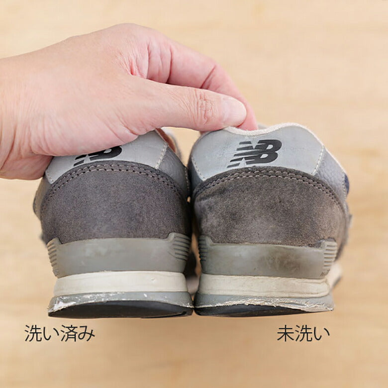 キャンバス地のスニーカーの他、カラースニーカー、レザースニーカーも洗えるスニーカー専用クリーナーとささらブラシのセットです。